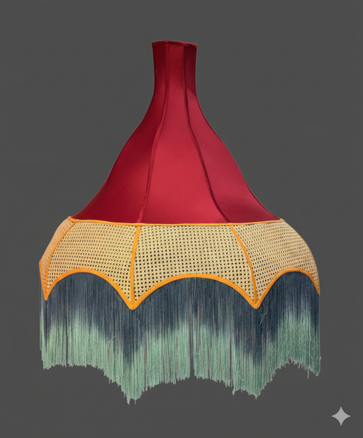 Color: Red, Natural Cane, Green FringeMaterial: Cane (Rattan), Fabric Shade, Fringe Detailing, Metal FrameStyle: Vintage / Retro Boho / Classic Art...